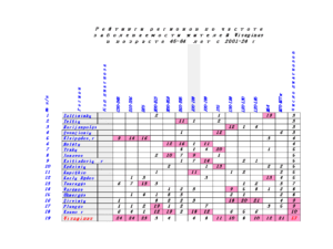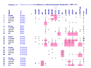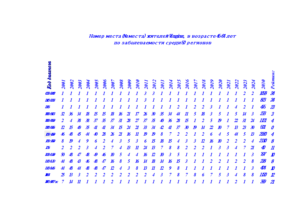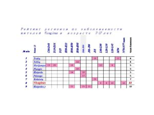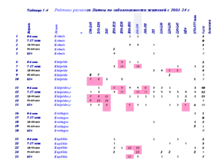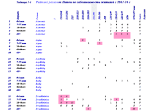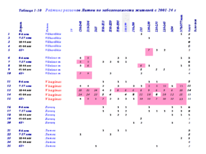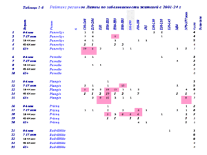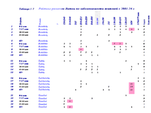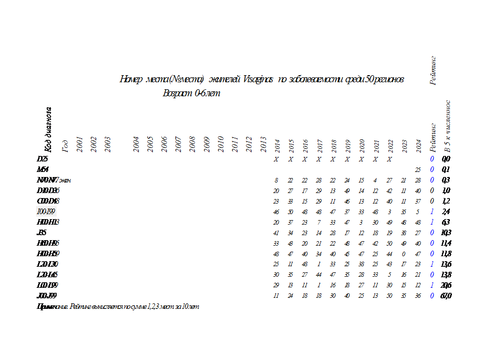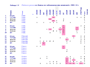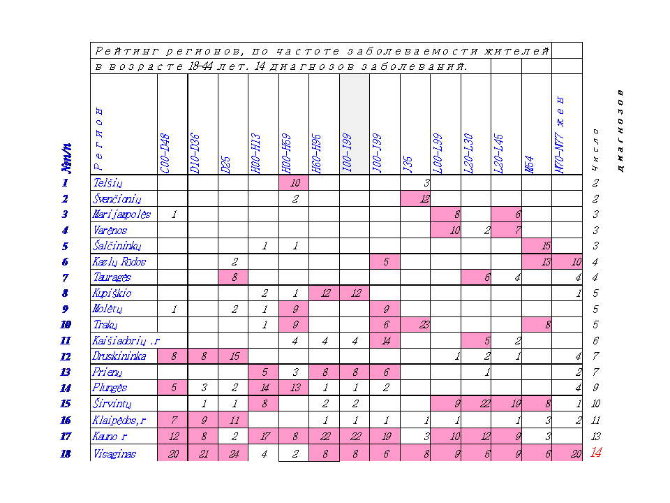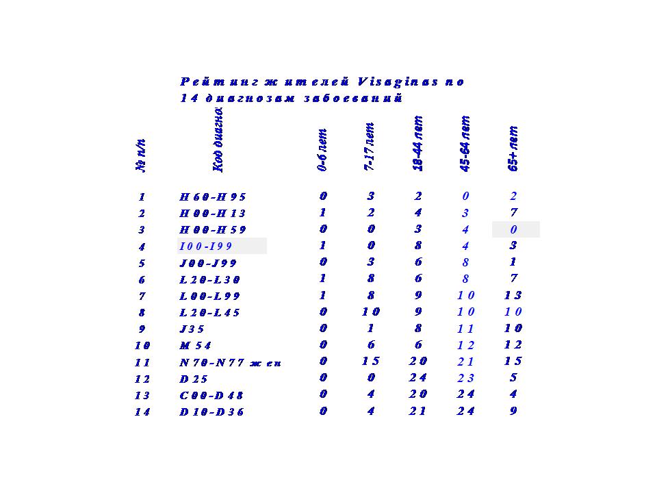 В таблице 3 представлены рейтинги жителей Visaginas по 14 диагнозам заболеваний за 24 года.