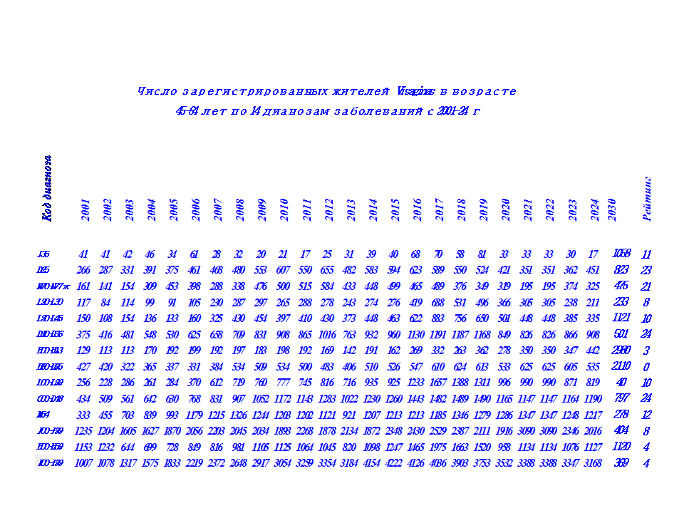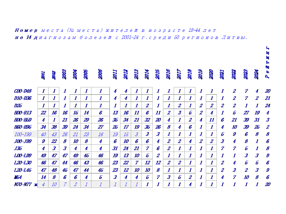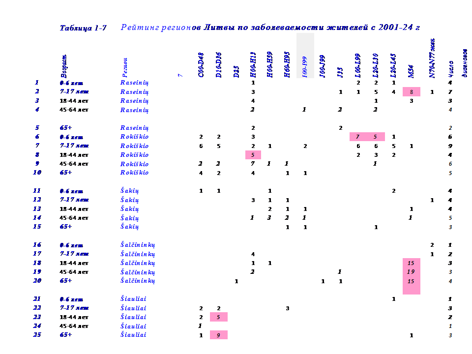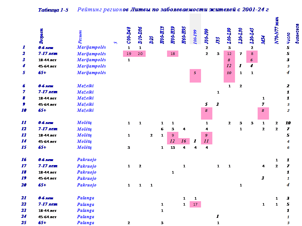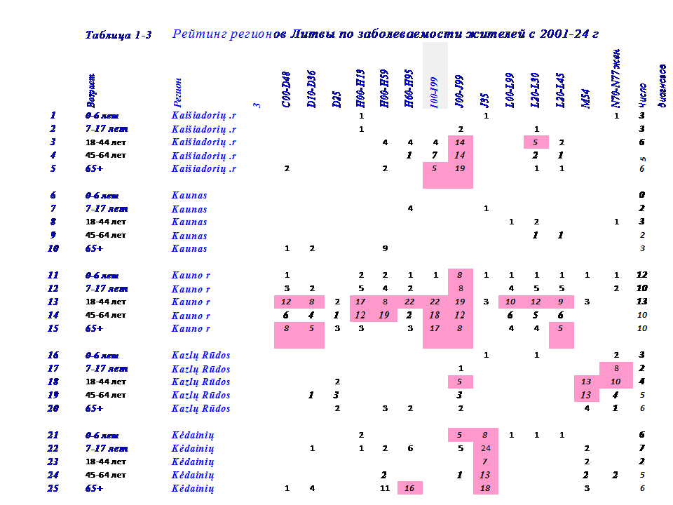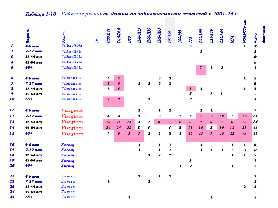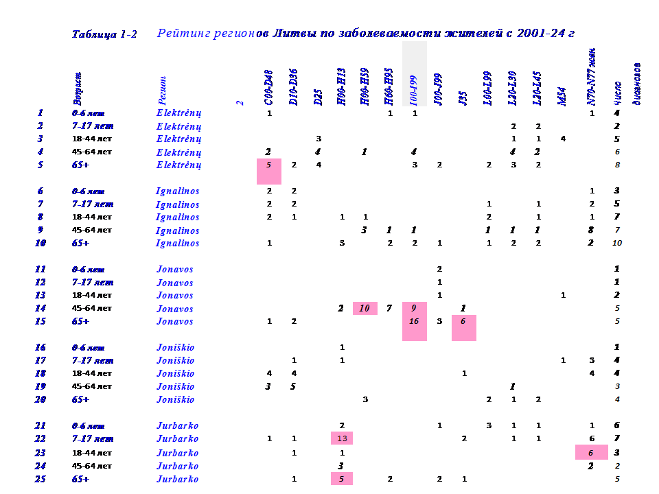 В этой связи, в 2024 г проведена систематизация данных по 14 диагнозам заболеваний у жителей в 50 регионах Литвы с 2001-24 г. по 5 возрастным группам: