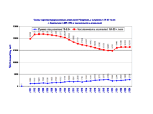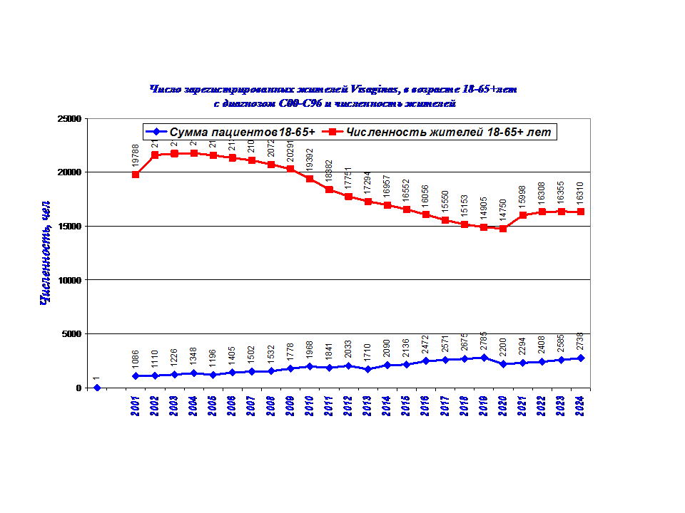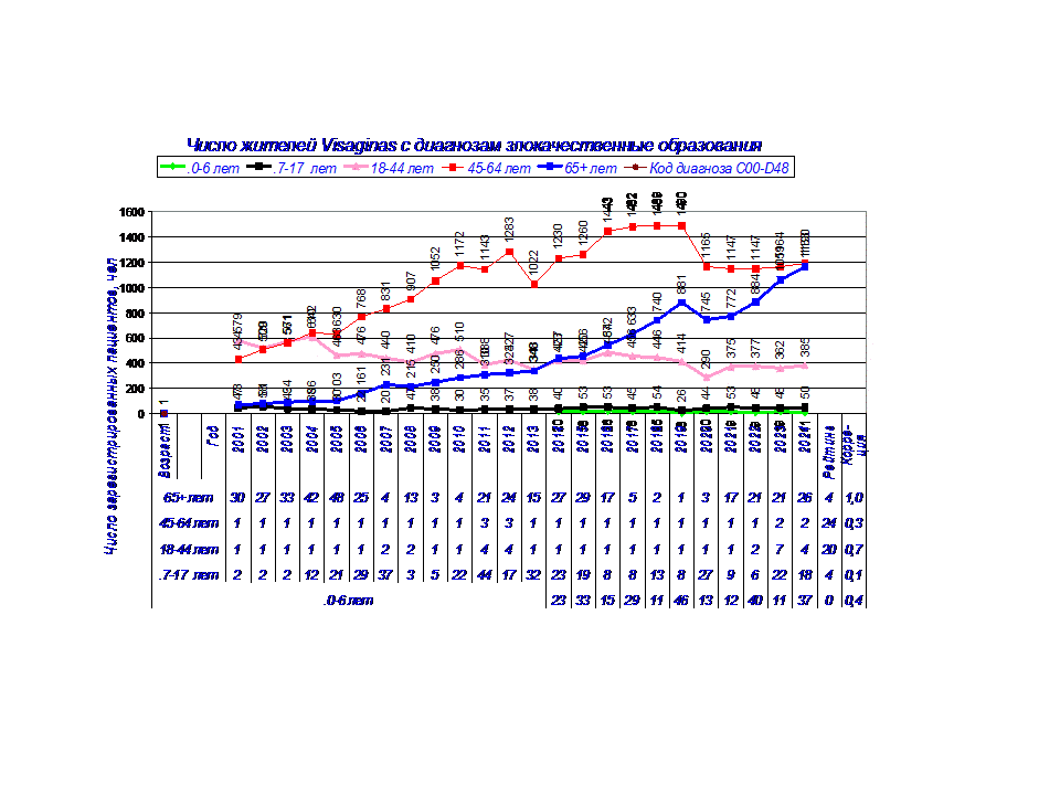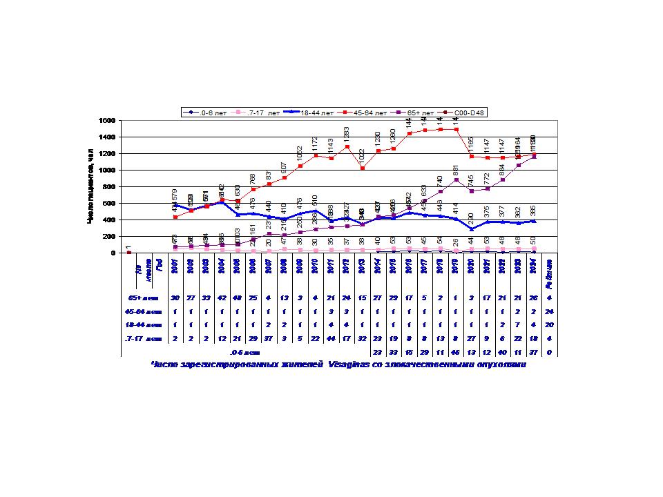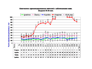 Число регистрируемых жителей Visaginasс с злокачественными образованиями продолжает увеличиваться. На диаграмме показано число регистрируемых жителей, уменьшенное в 10 раз (для диаграммы). На диаграмме 2 показана динамика числа регистрируемых пациентов и численности жителей Visaginas, в возрасте 18-65+ лет