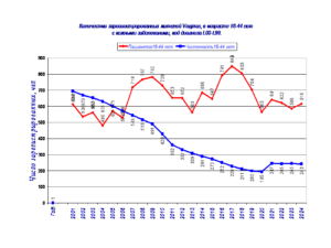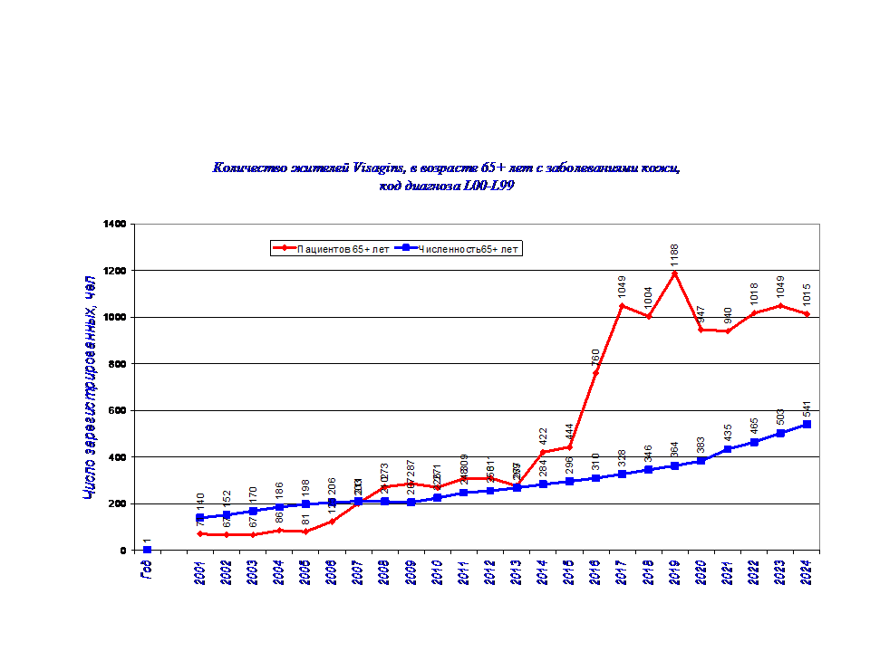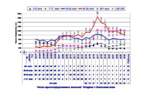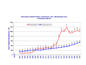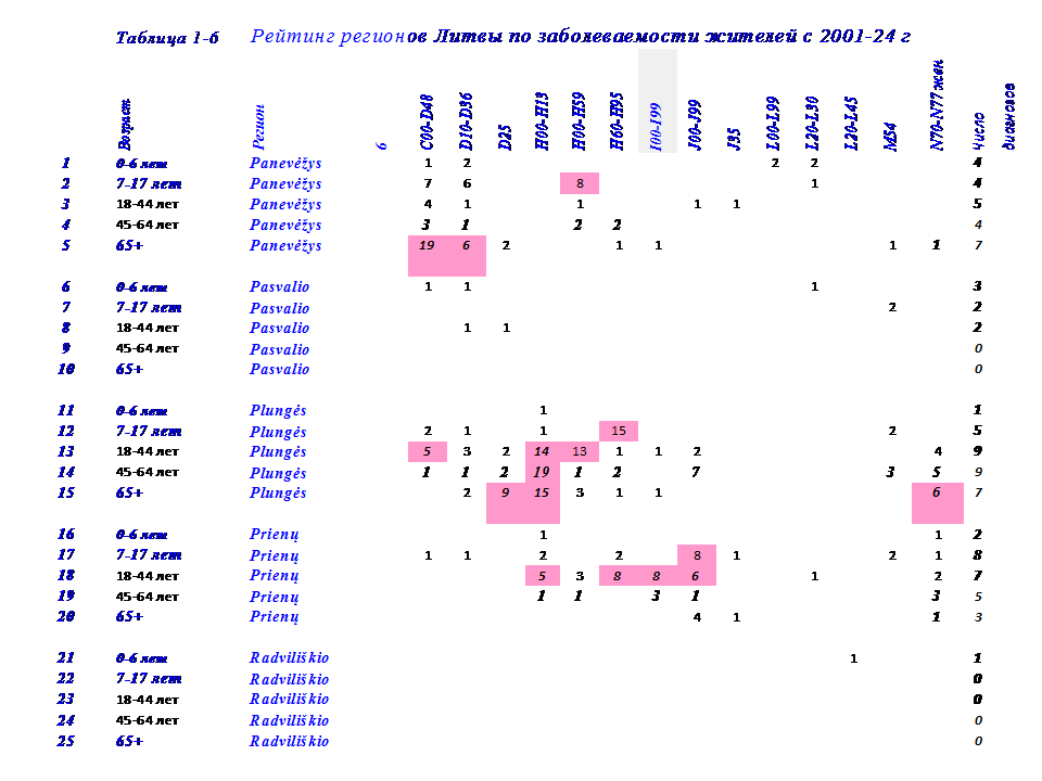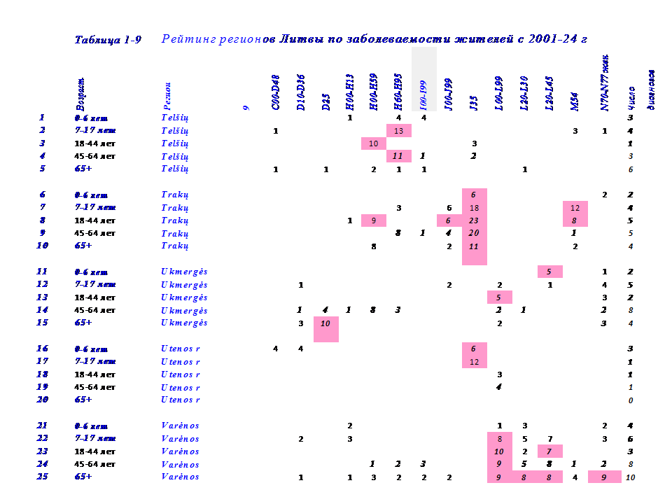 В этой связи в 2024 г, проведена систематизация данных по 14 диагнозам заболеваний у жителей в 50 регионах Литвы с 2001-24 г.65+ лет и 5 возрастным группам: