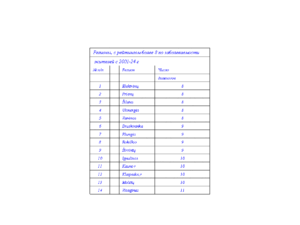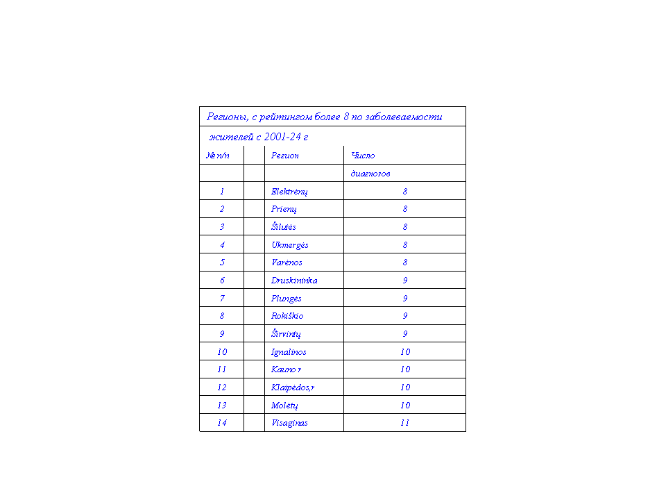 - Число регионов, рейтинг которых за 24 года, по заболеваемости жителей, был равен 0. К таким регионам относятся: Литва, Vilkaviškio, Utenos r, Radviliškio, Pasvalio, Kretingos, Kelmės, Kaunas,Alytus.