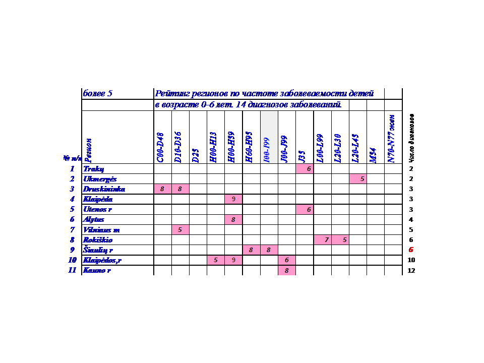По злокачественным и доброкачественным новообразованиям лидирующее положение занимает Druskininka, рейтинг 8. По заболеваниям глаз, и органов дыхания Klaipėdos,r, рейтинг 5,9,6 соответственно.