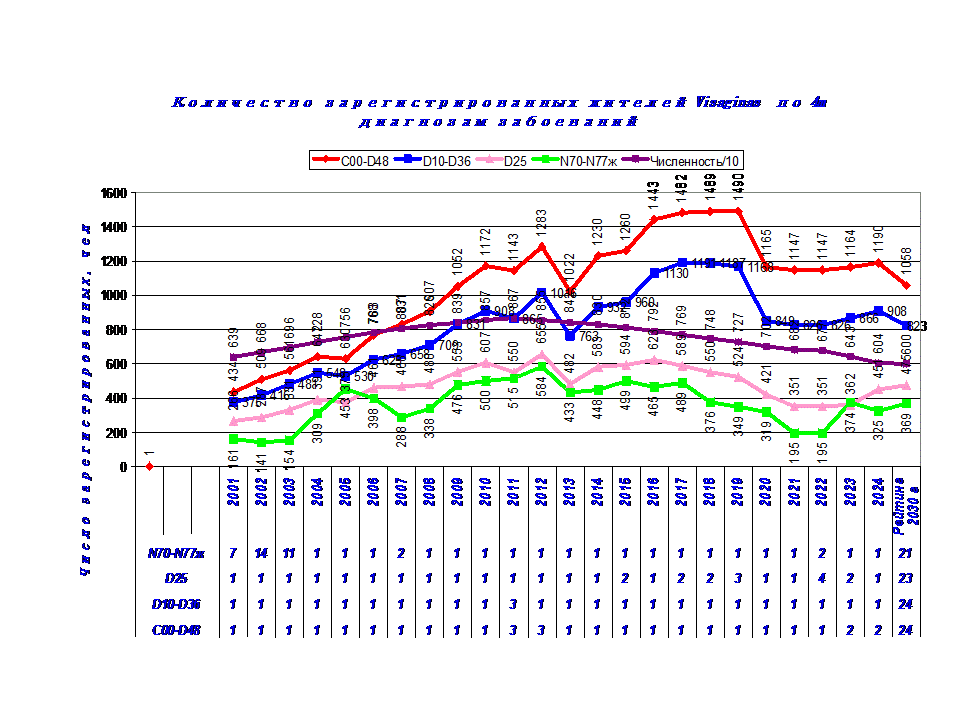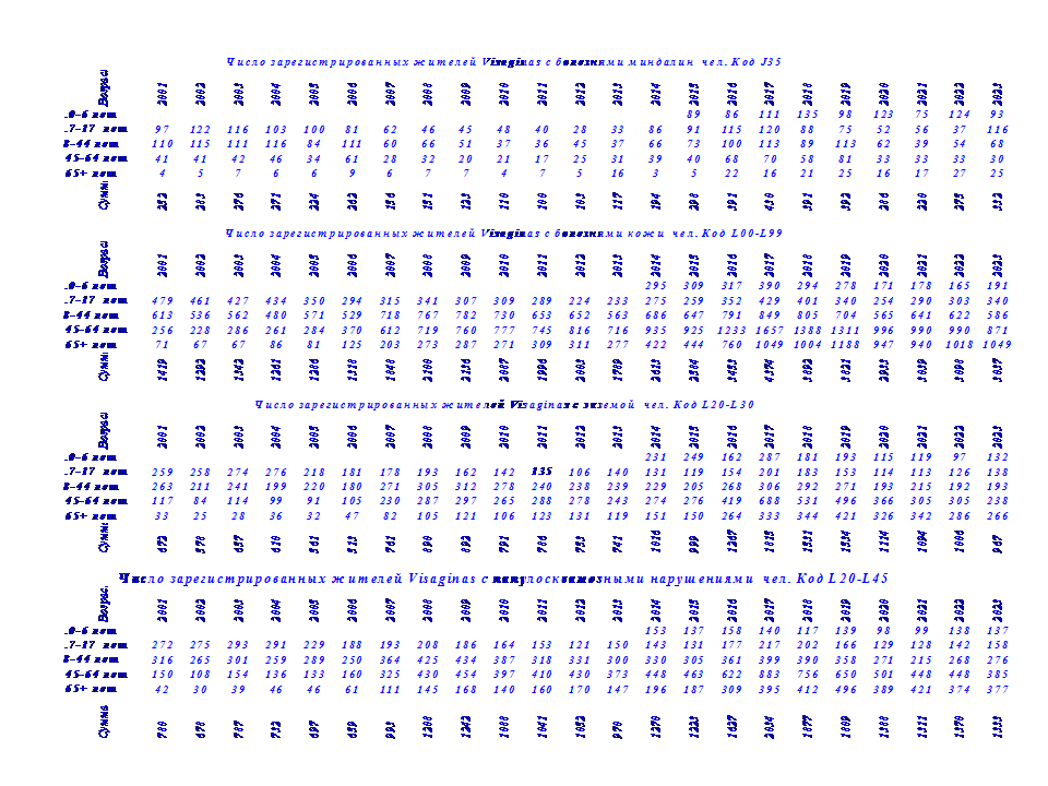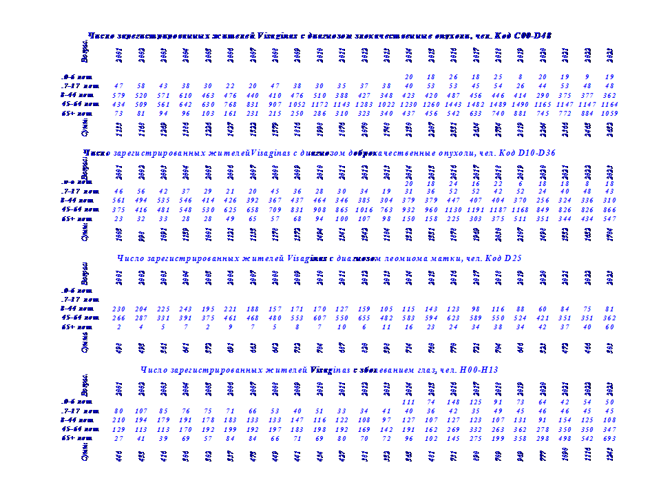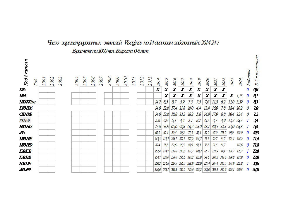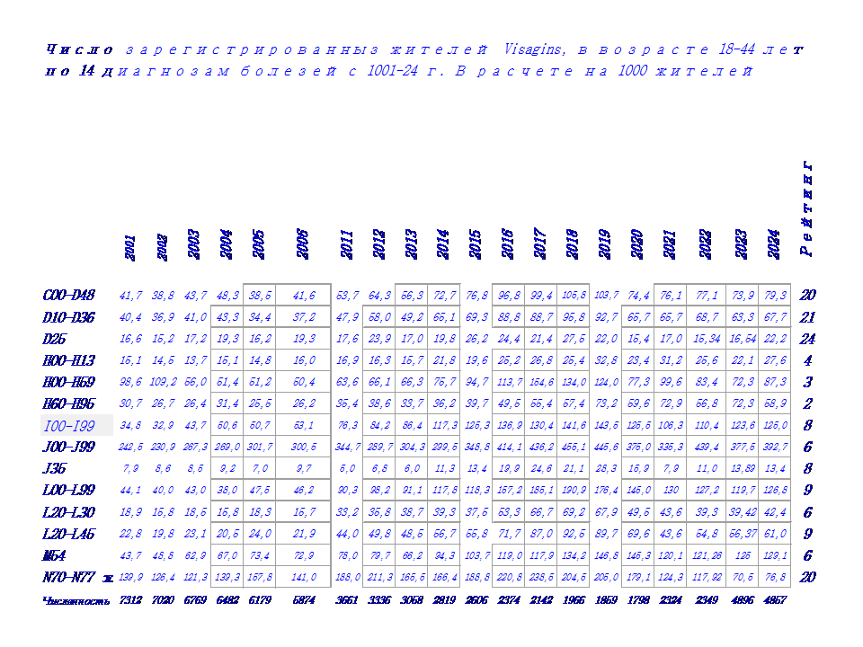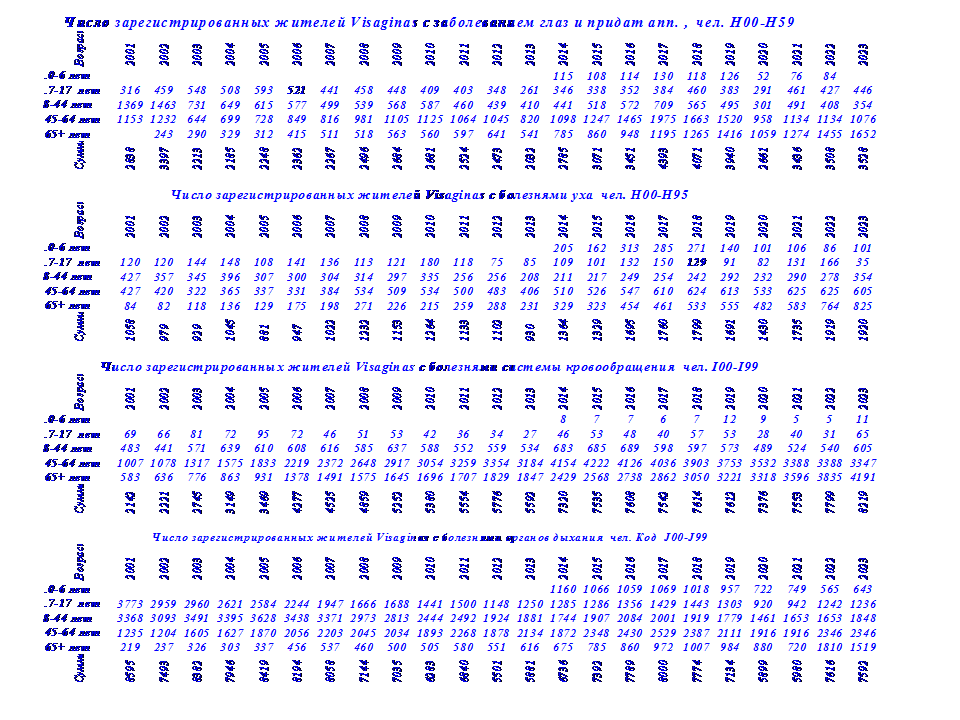 Здесь представлены данные о числе зарегистрированных жителей Visaginas по 14 диагнозам заболеваний в период с 2001 г по 2024 г., таблица 2.