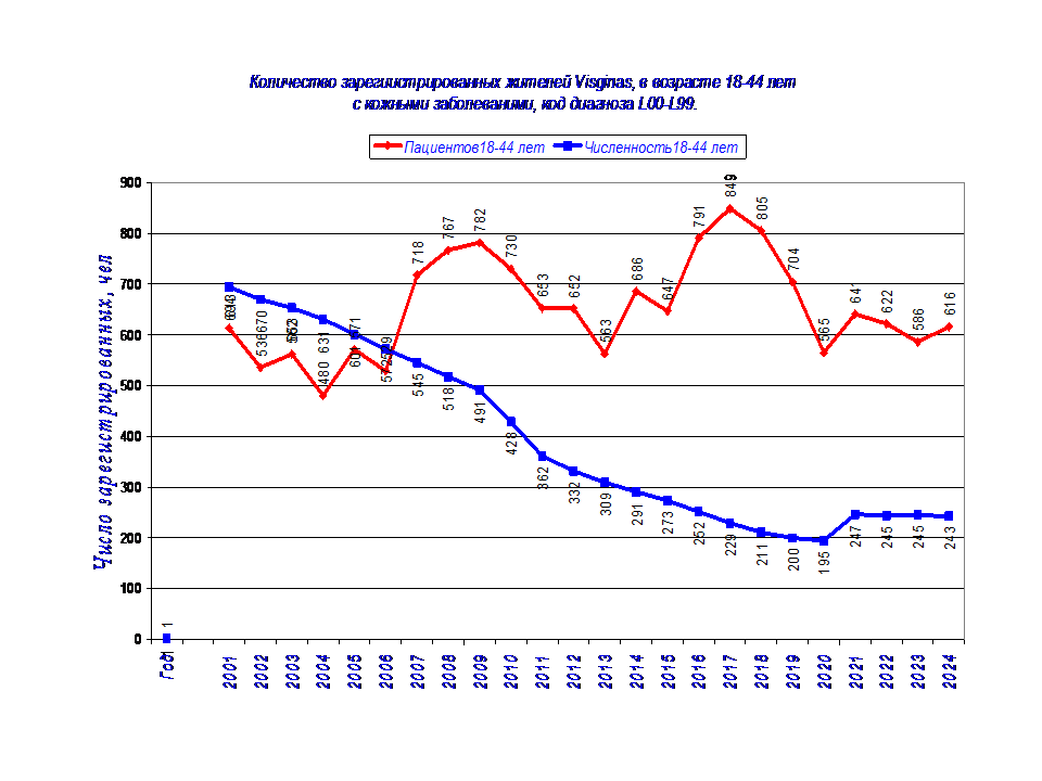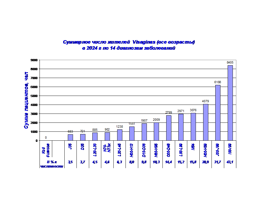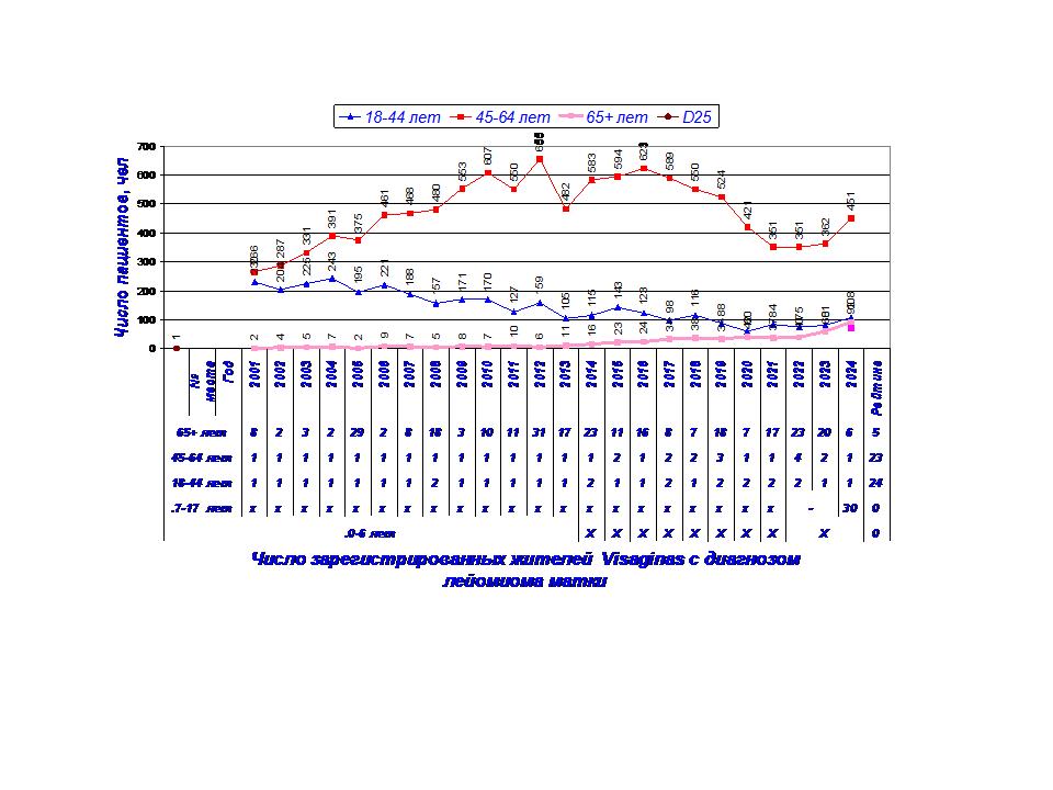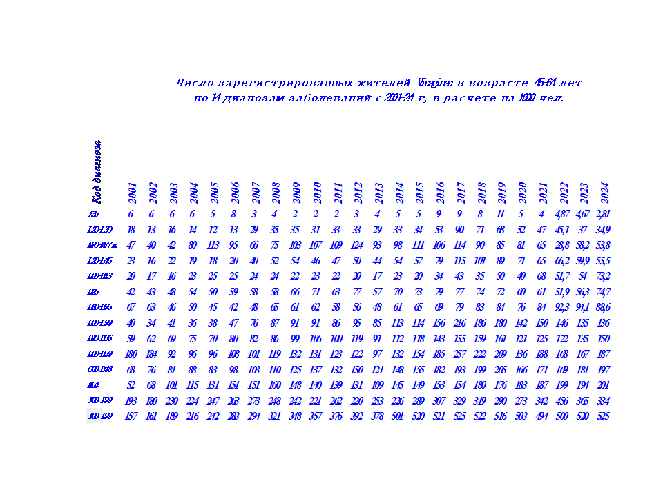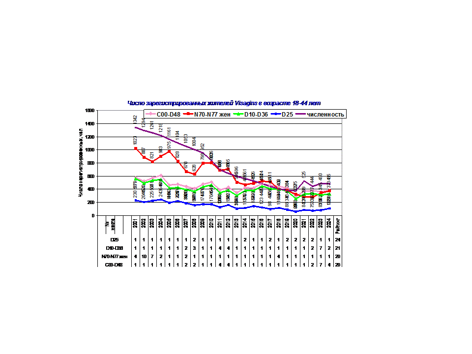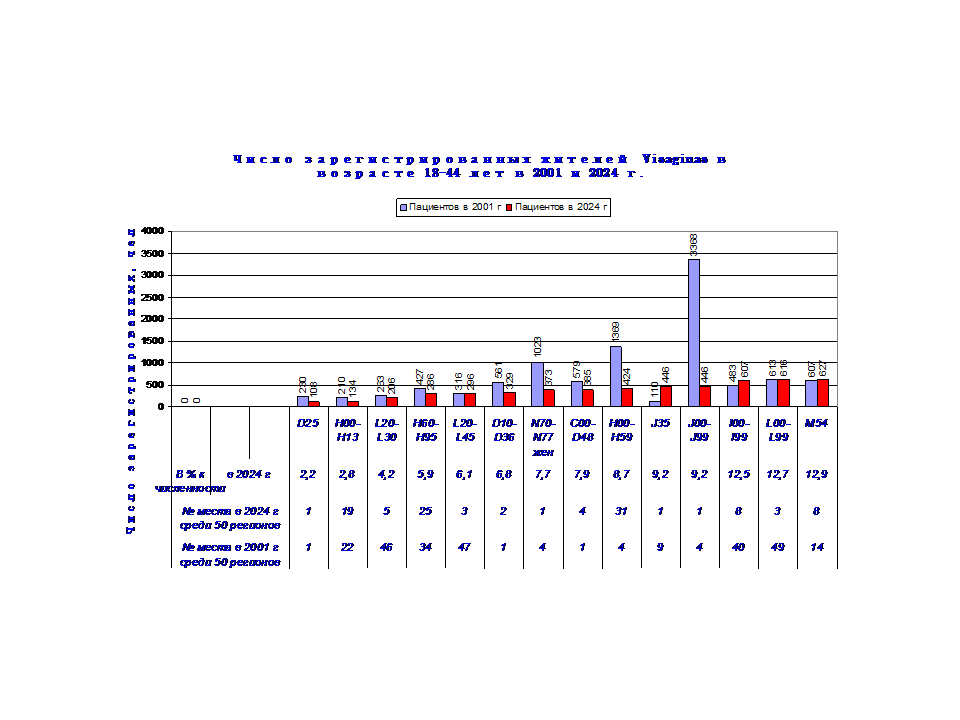 Здесь представлены данные о числе зарегистрированных жителей Visaginas по 14 диагнозам заболеваний в период с 2001 г по 2024 г., таблица 2.