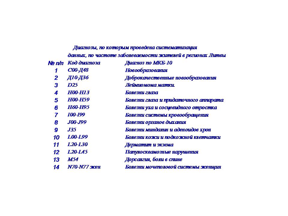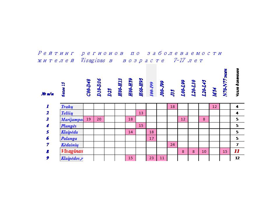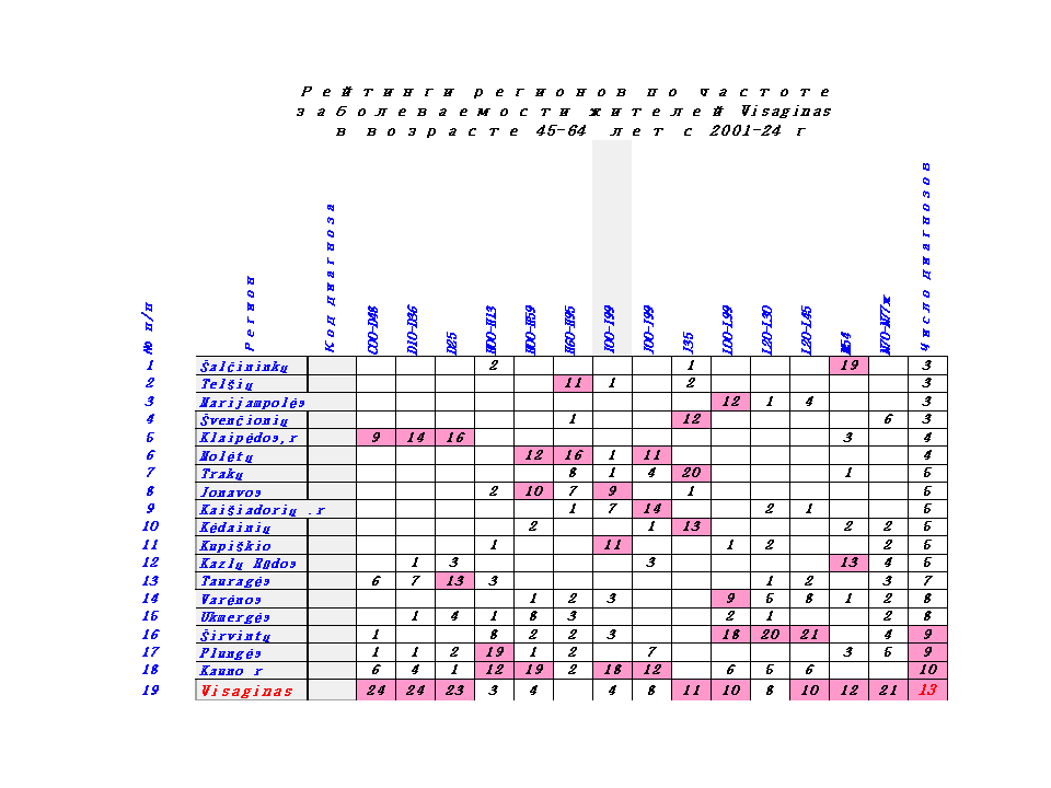Предварительный анализ частоты заболеваемости жителей в регионах Литвы показал, что в отдельных регионах заболеваемость жителей, по отдельным диагнозам, самая высокая, по сравнению с другими регионами в течение 24 лет. Так, жители Visaginas, в возрасте 45-64 лет занимали первые места в течение 24 лет по злокачественным заболеваниям, жители Kauno r занимали 22 раза первые места по заболеваниям уха и системы кровообращения. Однозначного ответа нет на вопрос: Почему в отдельных регионах заболеваемость жителей самая высокая на протяжен 24 лет?