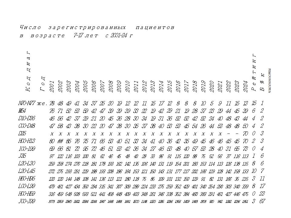 В 2024 г было зарегистрирован 1351 житель города в возрасте 7-17 лет с заболеваниями органов дыхания (66,6 № от общей численности). Второе место занимаю заболевания глаз 475 пациента (23,4% от общей численности), на третьем месте кожные заболевания 339 пациента (16,7% от общей численности). Самый низкий показатель у пациентов с заболеваниями мочеполовой системы — 13 пациентов (0,6 % от общей численности).