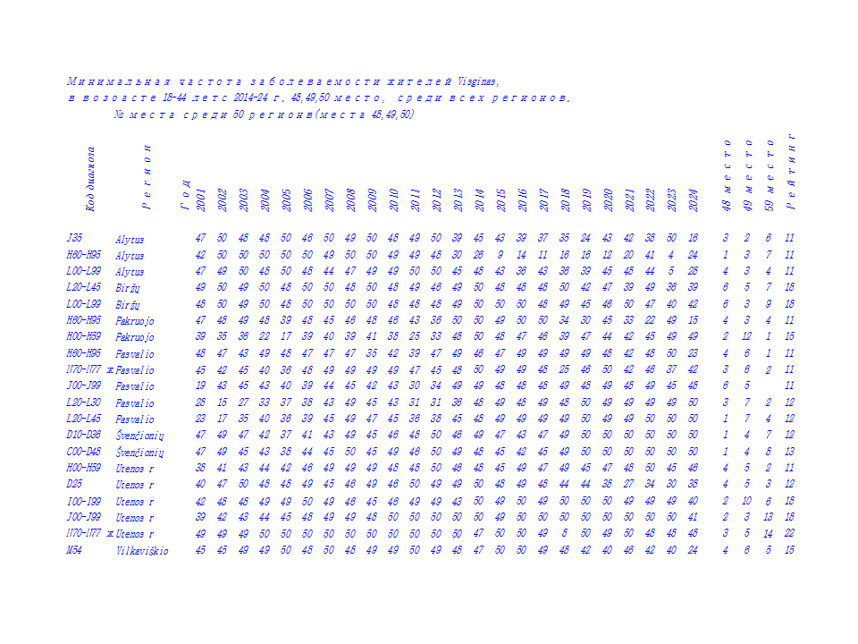 В 2024 г проведена систематизация данных по 14 диагнозам заболеваний у жителей в 50 регионах Литвы с 2001-24 г, по 5 возрастным группам:
