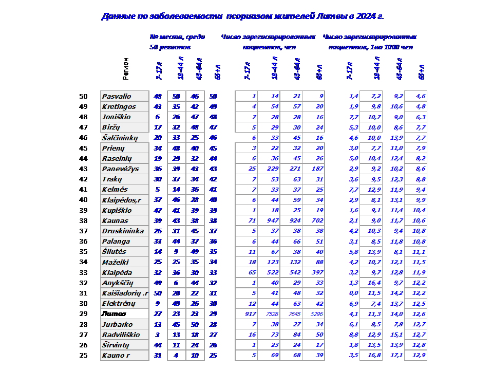 Здесь представлены данные по частоте заболеваемости псориазом жителей Литвы в 2024 г.