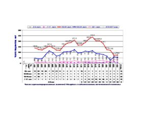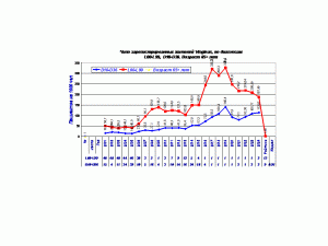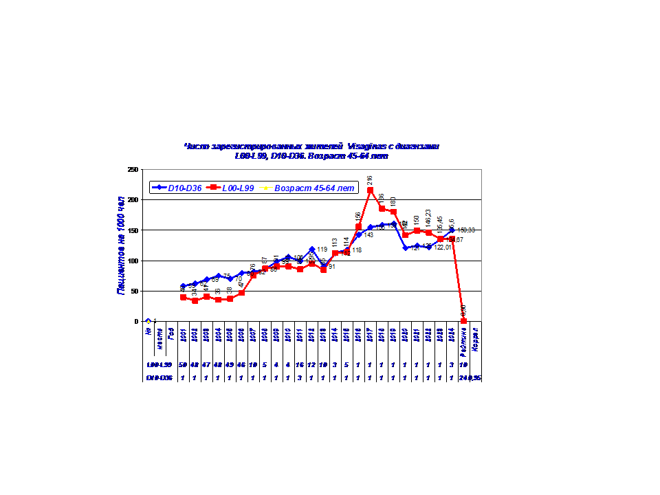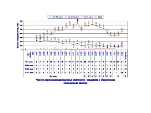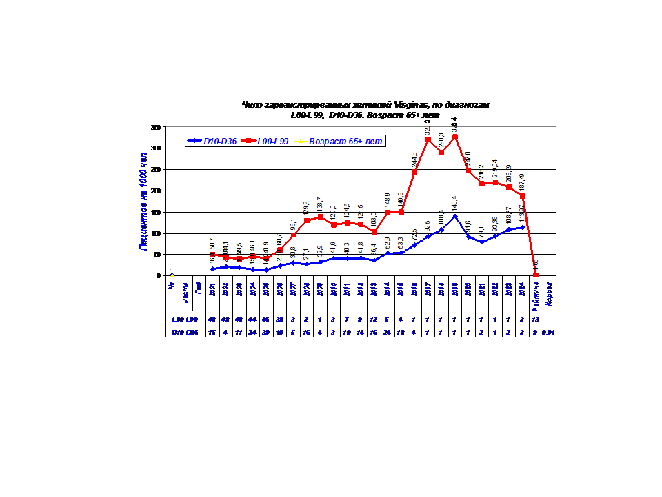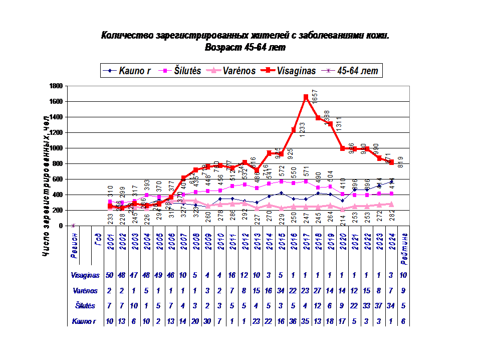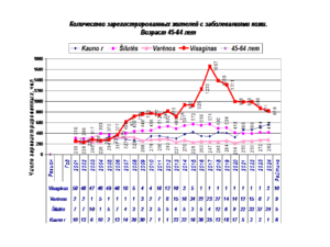 Высокие рейтинги наблюдаются по возрастным группам 45-64 лет и 65+ лет. После 2014-15 г резко увеличилось число пациентов с кожными заболеваниями. Динамика заболеваемости жителей Visaginas по 5 диагнозам представлены в диаграммах 1-5.