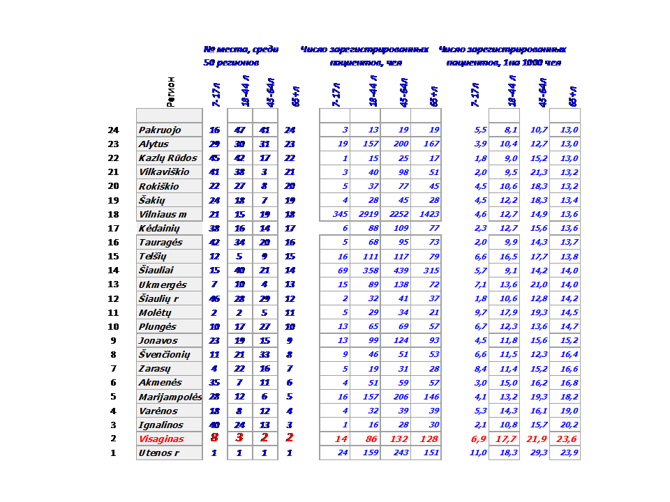 В таблице 4 число зарегистрированных пациентов в расчете на 1000 чел. По этим данным рассчитан рейтинг жителей Visaginas, по частоте заболеваемости среди 50 регионов Литвы.