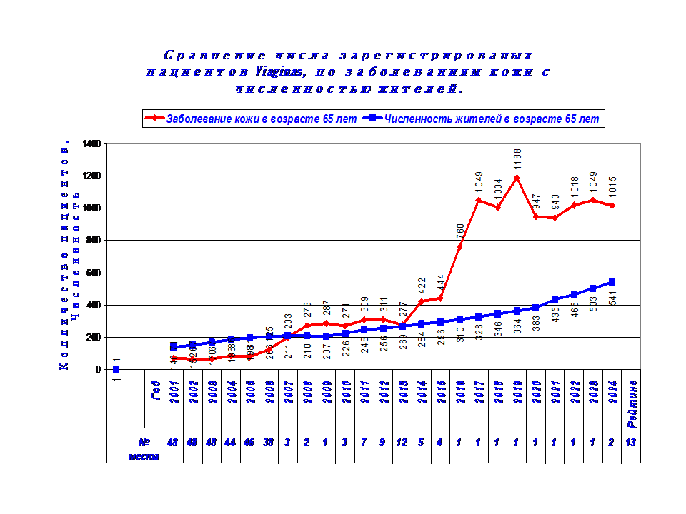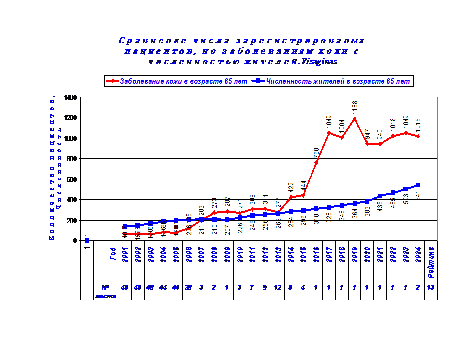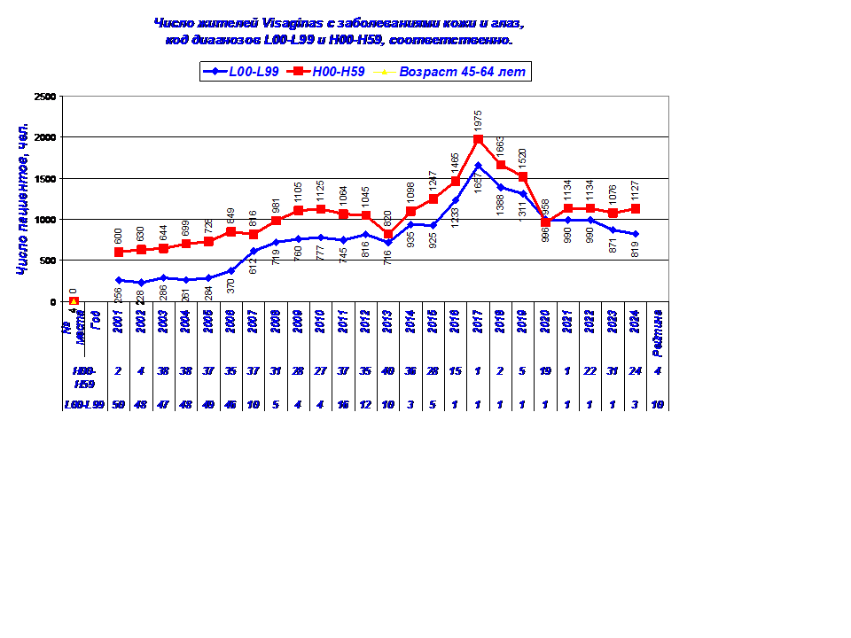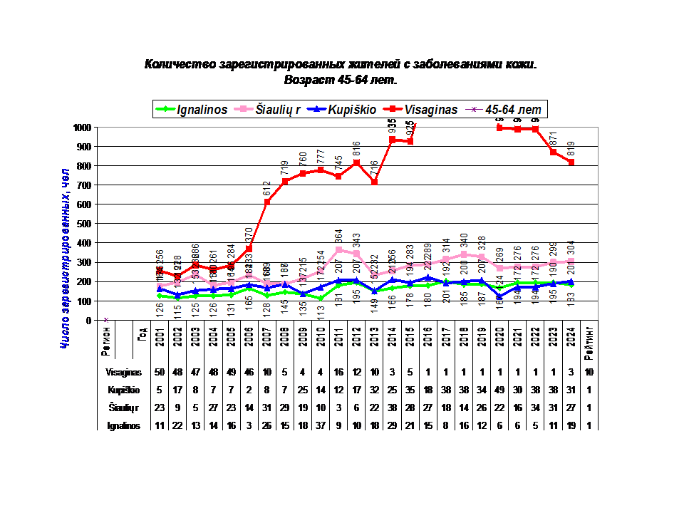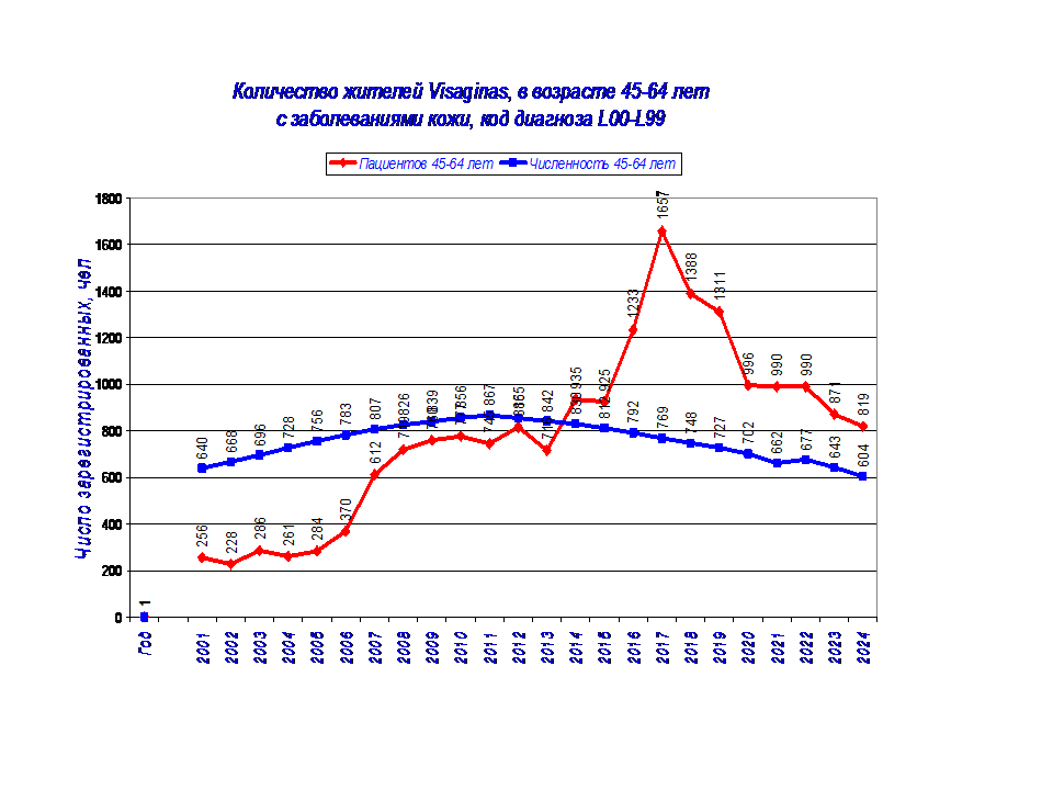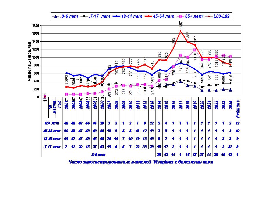 1. Динамика заболеваний кожи (код диагноза L00-L99) у жителей Visagins с 2001-24 г.