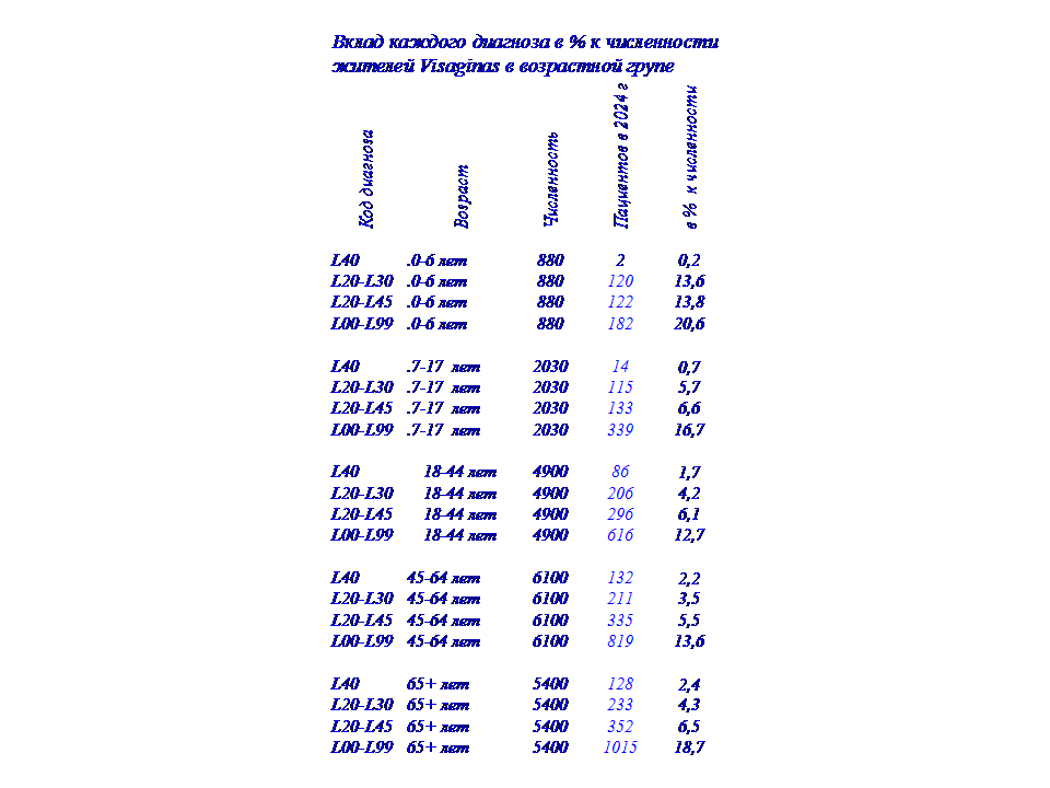Заболеваемость кожи (код диагноза L00-L99) самая высокая у детей в возрасте 0-6 лет – 20,6%. По этому диагнозу, самые высокие показатели по всем возрастным группам. Вызывают определенную обеспокоенность заболеваемость псориазом жителей Visaginas. Систематизированные данные по частоте заболеваемости жителей с 2001-24 г. показывают, что лидирующие позиции жители Visaginas занимают, как минимум, по 5 диагнозам заболеваний. Представленные данные свидетельствуют о том, что имеет место повышенная заболеваемость еще по одному диагнозу – псориазу, код диагноза L40.