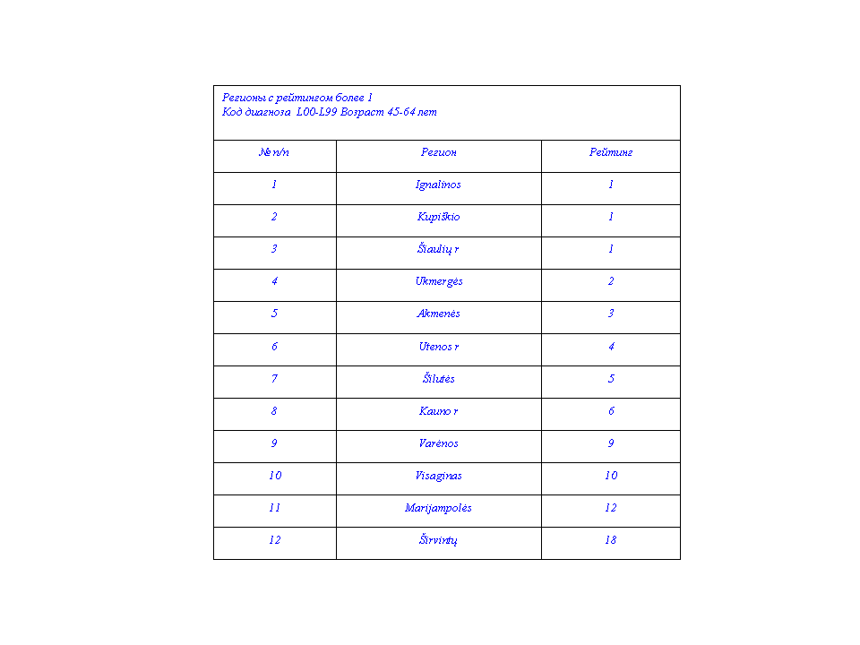 Из представленных данных следует, что регион Alytus (возраст 45-64 лет) имеет рейтинг 0, регион Biržų (возраст 45-64 лет и 65 лет) имеют рейтинг 1 по 2 диагнозам C00-D48 и H60-H95 . Самый высокий рейтинг имеют жители Druskininka в возрасте 7-17 лет, рейтинг по 9 диагнозам. C00-D48, D10-D36, H00-H13 H00-H59, J35, L00-L99, L20-L30, L20-L45,N70-N77 жен.