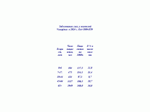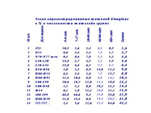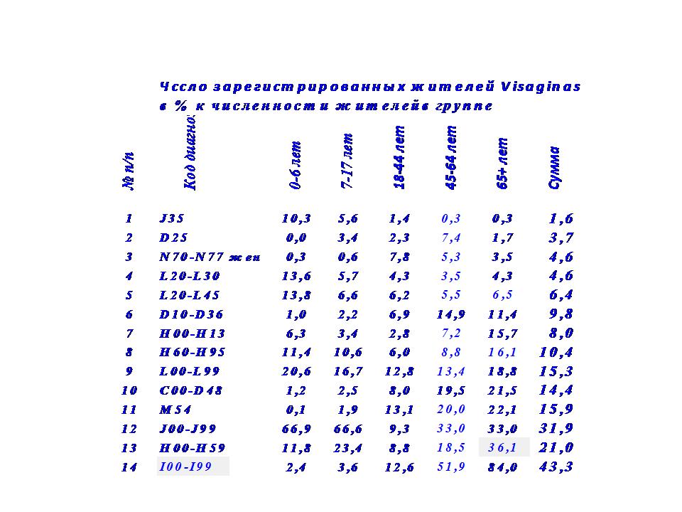 В таблице 4 представлены данные о числе зарегистрированных жителей Visaginas по 14 диагнозам в процентах к численности жителей в возрастной группе.