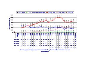После 2013 г и 2014 г заболеваемость кожи резко возросла, максимум заболеваемости отмечен в 2017 г по всем возрастным группам. В 2024 г наблюдается снижение заболеваемости кожи по всем группам, особенно у детей в возрасте 0-6 лет.