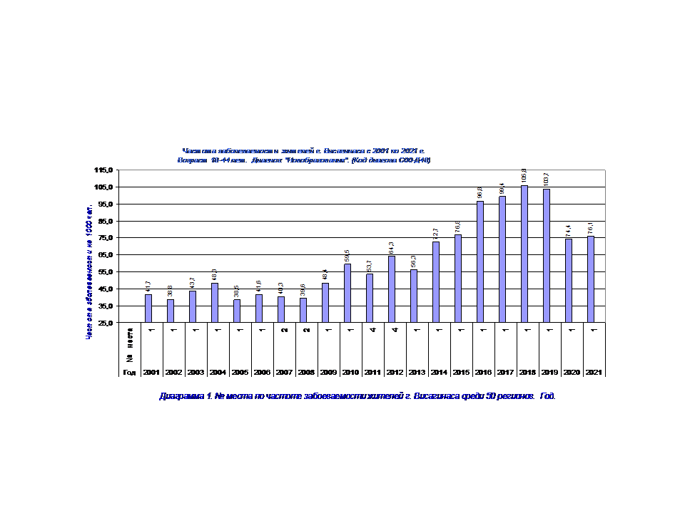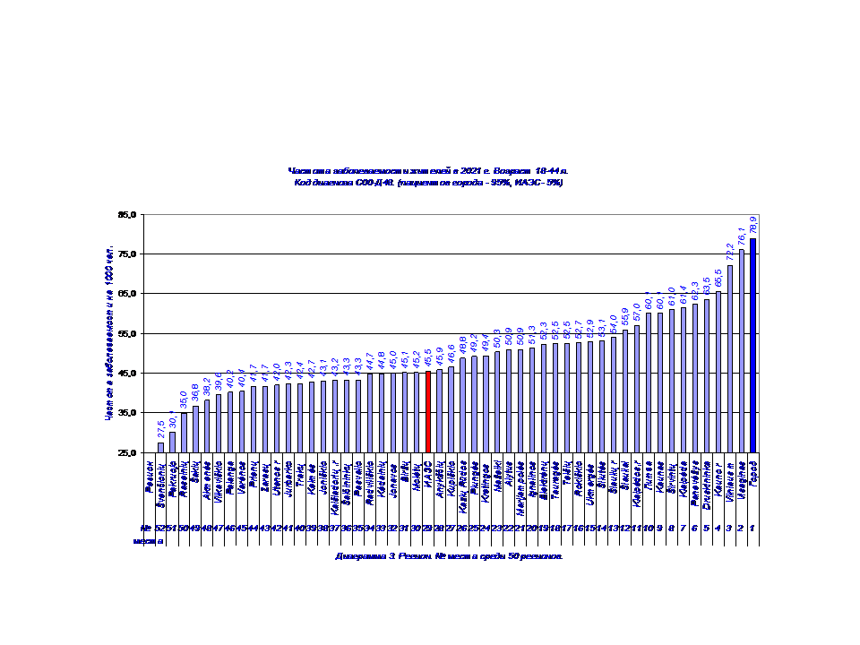 Среднее значение частоты заболеваемости, рассчитанное по 50 регионам составляет 48,9 ± 9,8 случаев на 1000 чел, по возрастной группе 18-44 лет.