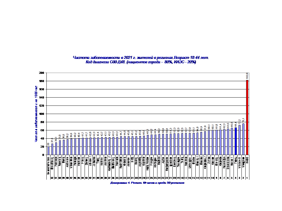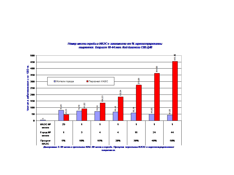 Очевидно, что если число зарегистрированных пациентов, из общего числа по всему городу 375 чел, персонал ИАЭС составит 10%, то в этом случае жители города переместятся на 3 место, а персонал ИАЭС на первое. С увеличением вклада персонала ИАЭС в зарегистрированные пациентов частота заболеваемости жителей город (без персонала ИАС) будет смещаться к 50 месту (диаграмма 1).