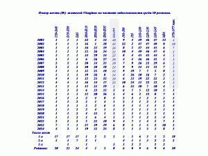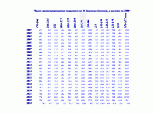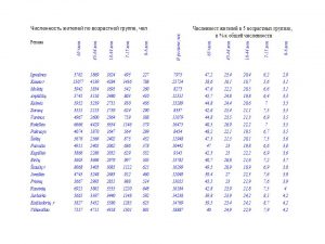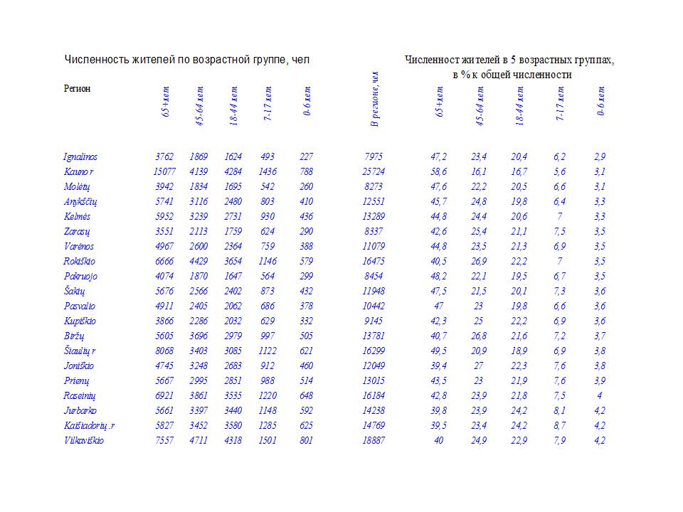 На основании данных института гигиены Литвы [1] проведен расчет численности жителей в 50 регионах Литвы по 5 возрастным группам. Данные представлены в таблице 1.
