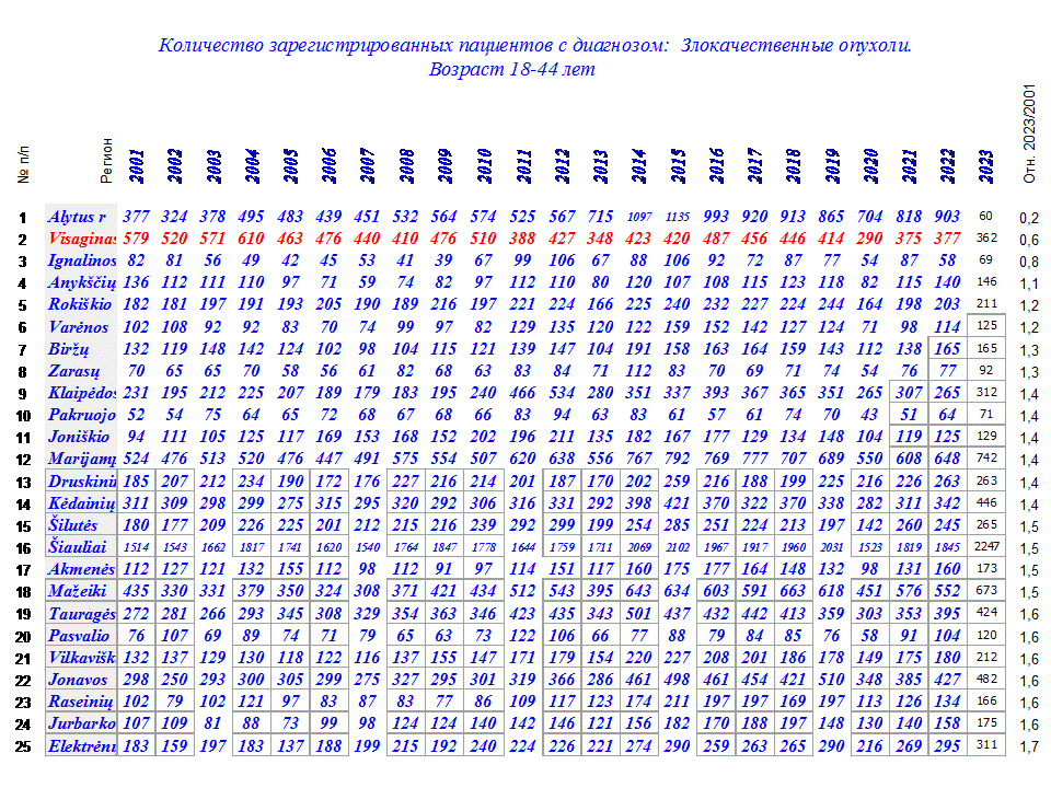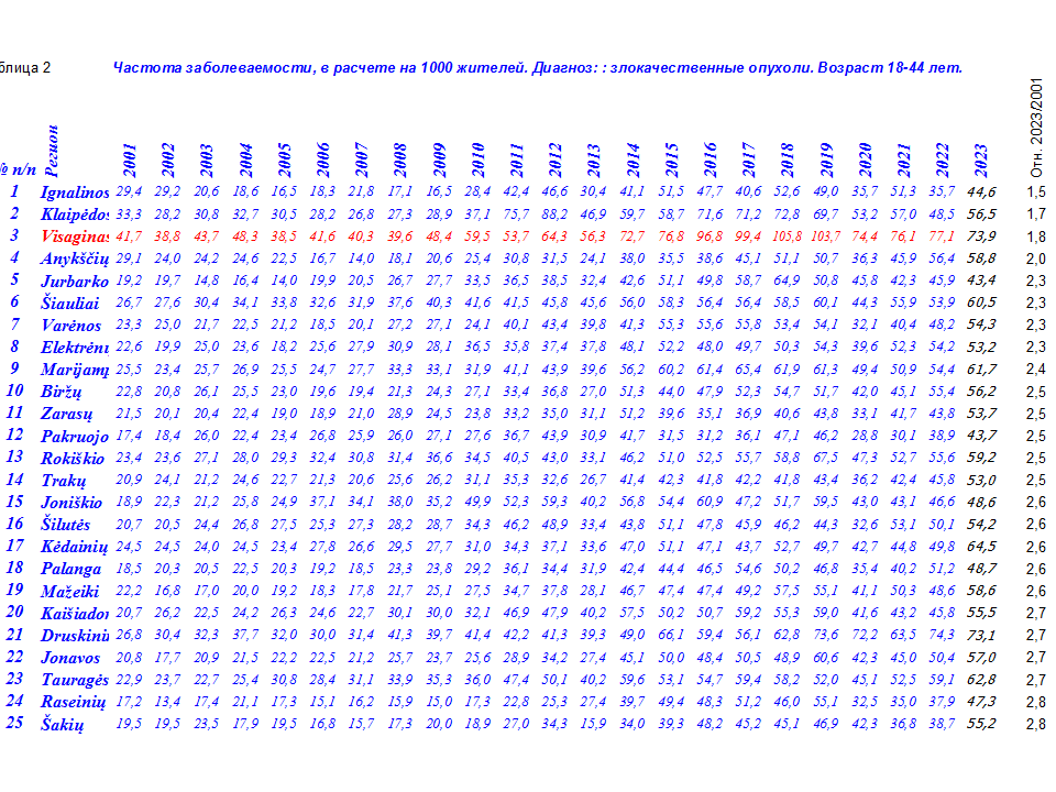 Причем, злокачественные опухоли прогрессируют во всех регионах, такая тенденция заметна на примере Visaginas, смертность в Visaginas от злокачественных опухолей, в 2001 г была на 50 месте, а в 2024г. сместилась на 21 место, среди всех регионов Литвы.