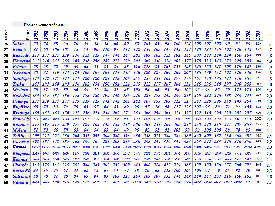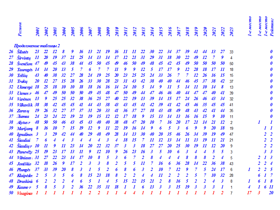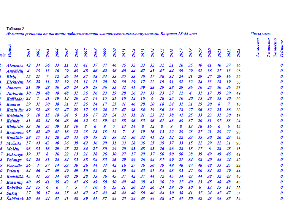 Пример расчета рейтингов регионов, по частоте заболеваемости жителей Литвы с 2001 г. по 2023 г.