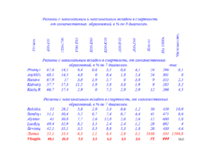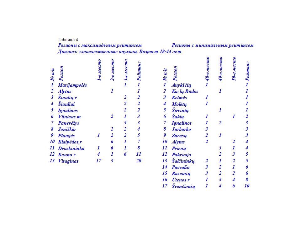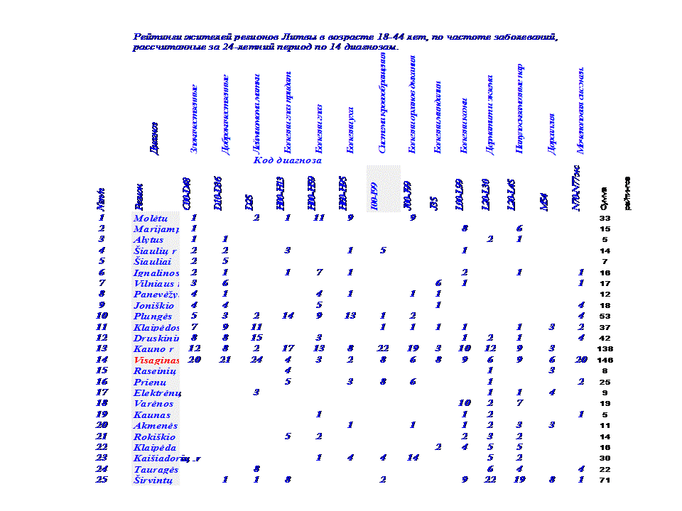 В таблице 1 представлены рейтинги жителей регионов Литвы в возрасте 18-44 лет, рассчитанные за 24-летний период по 14 диагнозам заболеваний