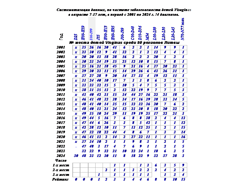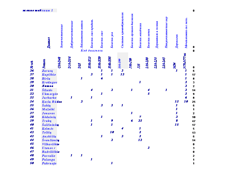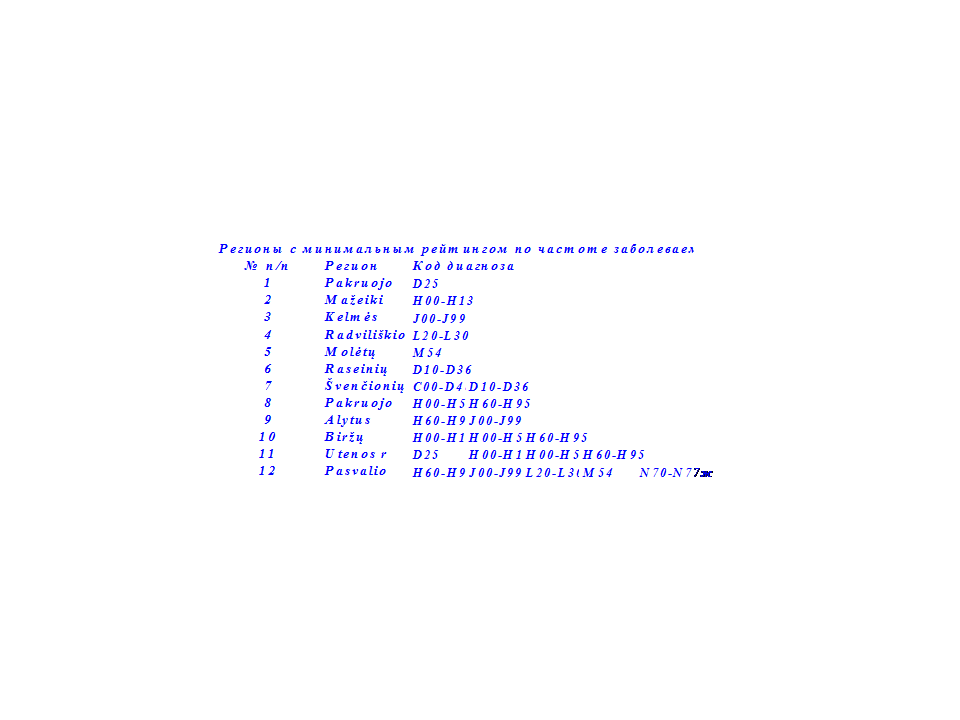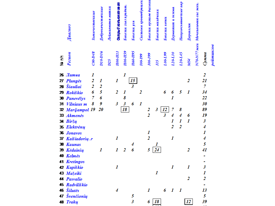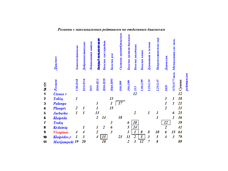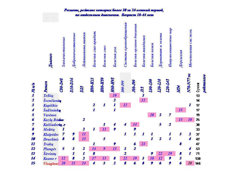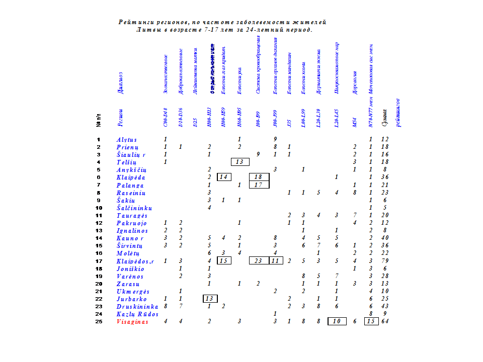 В таблице 1 представлены все регионы Литвы, рейтинг которых за 24-летний период, хотя бы 1 раз был равен 1 и более. Высокий рейтинг регионов более 1 отмечен с диагнозом D25 — 13 регионов, с I00-I99- 14 регионов, с диагнозами — J00-J99, C00-D48, J35, L20-L30 -15 регионов. Самое большое число регионов с высоким рейтингом отмечено по заболеваемости ушей и мочеполовой системы женщин – 20 регионов.