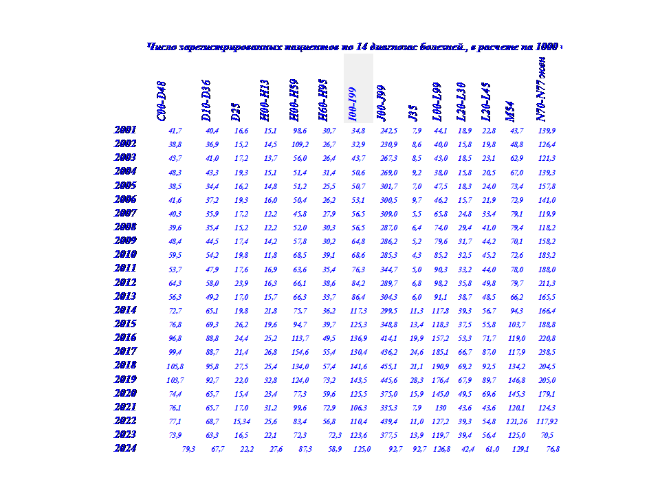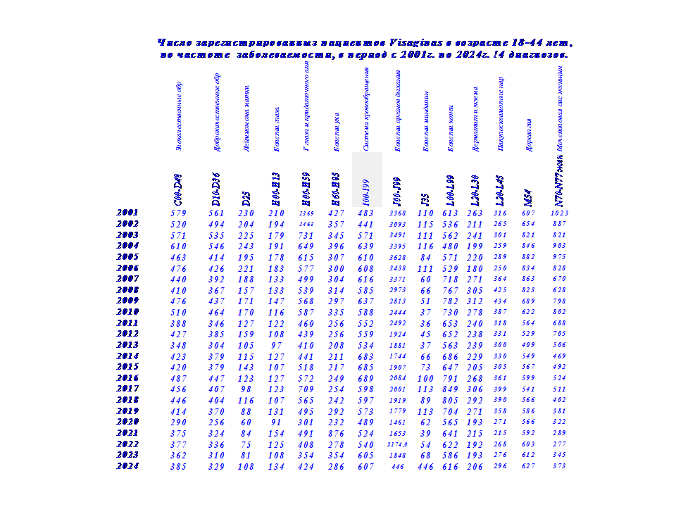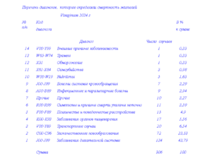 В таблице 1 представлены данные Visagnas, по числу смертельных исходов в 2024 г. по 14 диагнозам болезней.