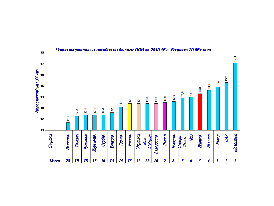 Обращает на себя внимание высокая смертность в европейских странах таких как: Латвия 14,3 смертей на 1000 чел, Литва 13,5 на 1000 чел, Белоруссия 13,4 на 1000 чел, Россия и Украина по 13,4 на 1000 чел. Таким образом, жители Литвы занимают 9 место по уровню смертности среди 196 стран.
