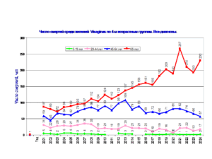 Число смертельных исходов в 2024 г в возрасте 65+ лет увеличилось в 3,9 раза по сравнению с 2001 г., в то время как, численность в этой возрастной группе увеличилась только в 2,6 раза.