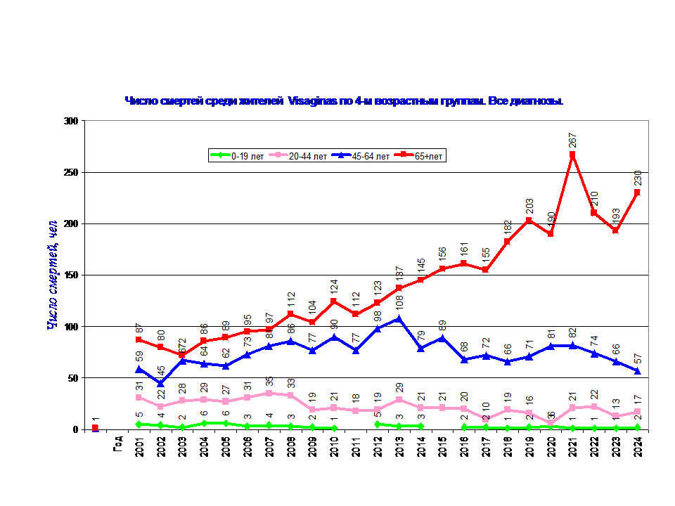 На диаграмме 3 представлены данные, по числу смертельных исходов среди жителей Visaginas с 2001-24 г, по 4-м возрастным группам.