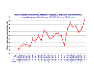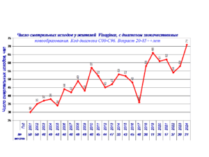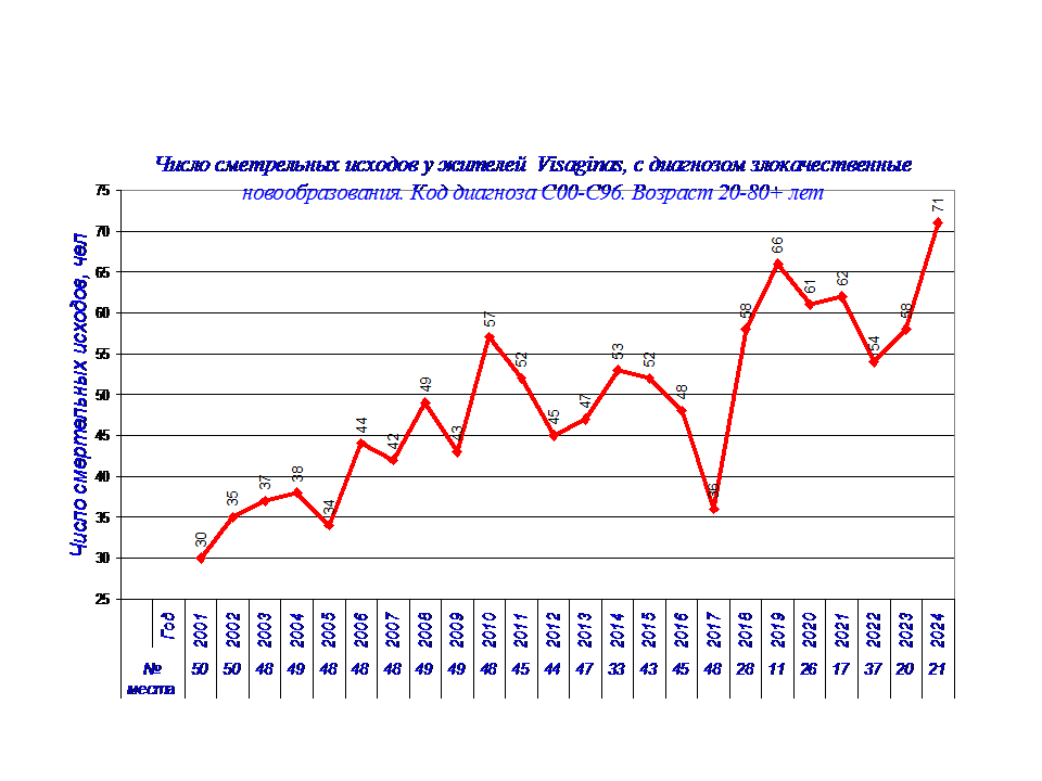 Следует отметить, что количество смертей от злокачественных новообразований в Visaginas увеличивается из года в год. Если, в 2001 г число смертей было 30, то в 2024 г уже 71 причем, номер места среди всех регионов, смещается в сторону первых мест.