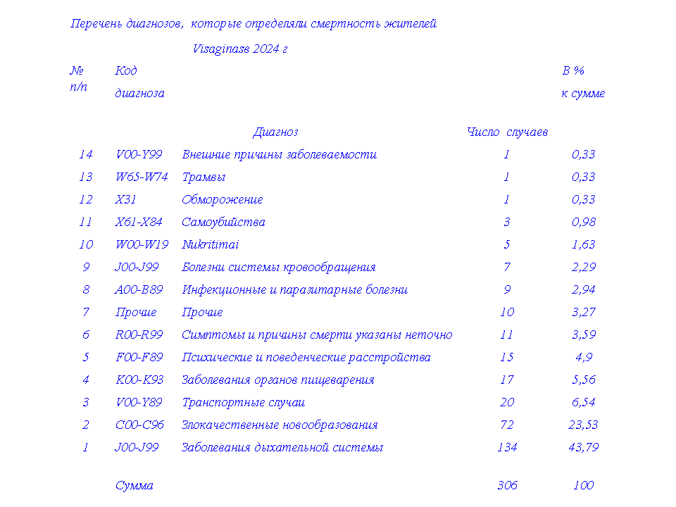 Данные, по смертности жителей Visaginas, в возрасте 20-85+ лет систематизированы по 14 диагнозам заболеваний. В 2024 г зарегистрировано 134 случая смертельных исходов от болезней органов дыхания (43,79 % от всех диагнозов). На втором месте,– смертность от злокачественных новообразовании – 72 случая (23,53 % от всех случаев). Смертность от остальных заболеваний менее 7%.