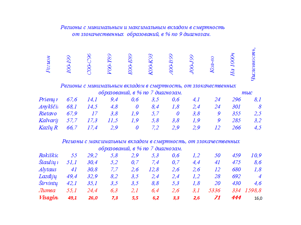 — показано, что сравнительный анализ по частоте заболеваемости жителей по регионам, рассчитанной на 1000 чел по определенной возрастной группе, носит неопределенный характер. При таком расчете все жители г. Висагинаса имею самую высокую вероятность заболевания с диагнозом — новообразования,