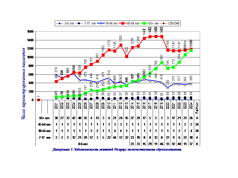 Так, в 2021 г. систематизированы данные заболеваемости по четырем возрастным группам населения, диагноз С00-Д48 «Новообразования»: