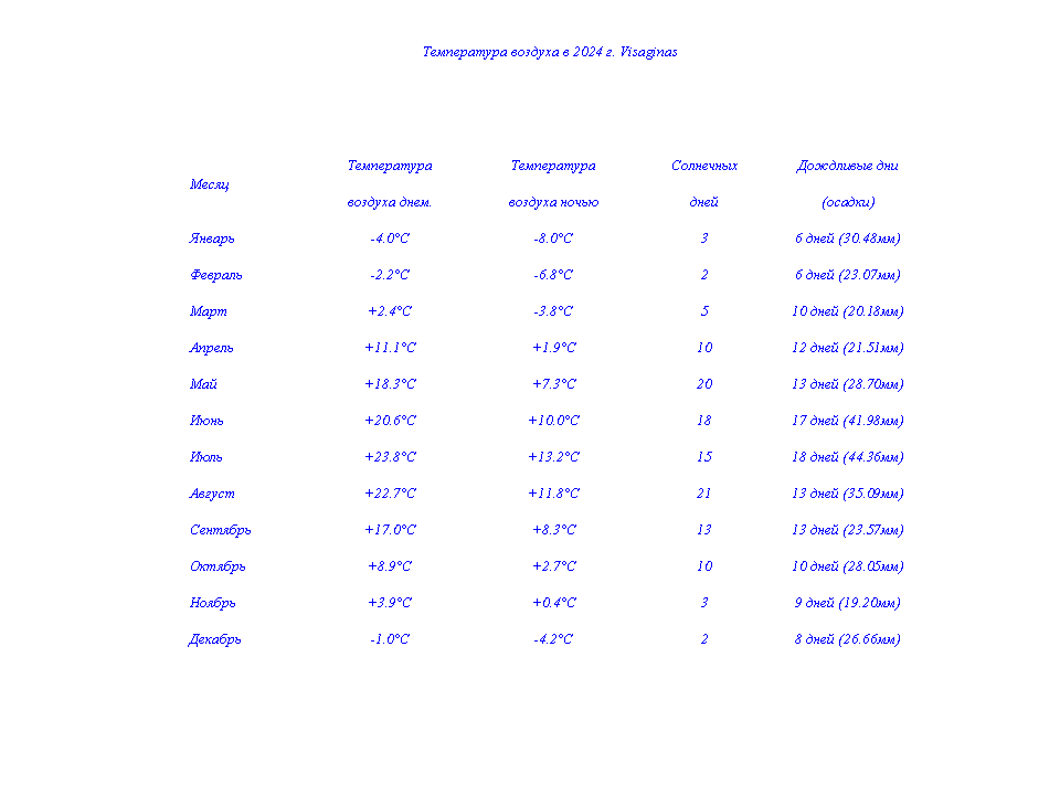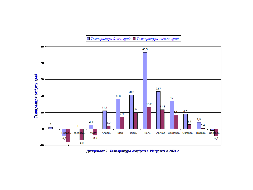 Максимальная температура воздуха в Vusginas в 2024 г была в июле – 23,8 С- днем и 10.0 С -ночью.