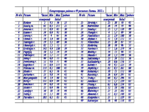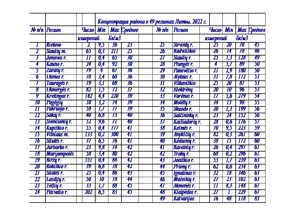 В 2022 г Центром радиационной безопасности Литвы представлены результаты измерения концентрации радона-222 в 49 регионах, таблица 1.