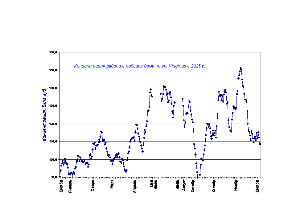 В 2023-24 г, в подвальном помещении дома по ул. Visaginas был установлен детектор радона SIRAD. Среднесуточные концентрации радона с декабря 2023 г по декабрь 2025 г, представлены на диаграмме 3.
