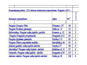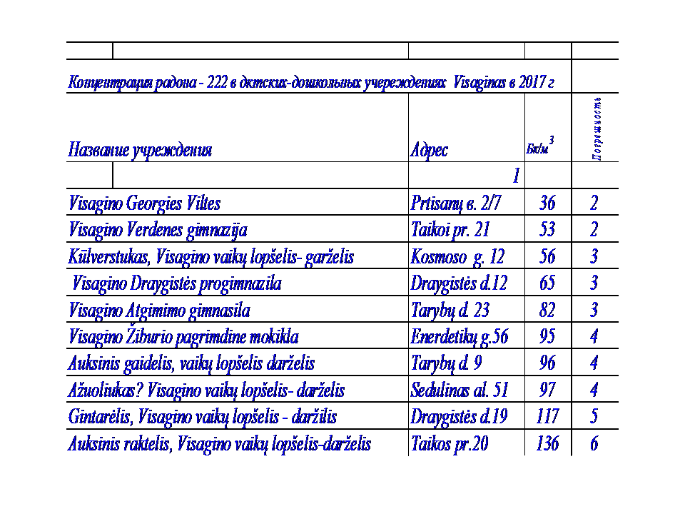 В феврале 2017 г (с 2017-2-01 по 2017-3-06) Центром радиационной безопасности Литвы в 10 детских дошкольных учреждения Visaginas были установлены накопительные детекторы измерения концентрации радона-222. Результаты изменений приведены в таблице 2.
